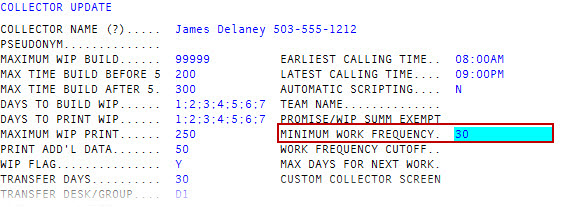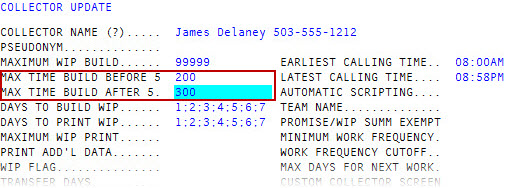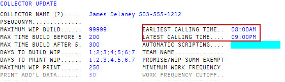 This entry does not restrict any functions, but displays a warning message if an account is brought up on the Collector screen before this time. To have no message display, as for support desks, leave the field blank.