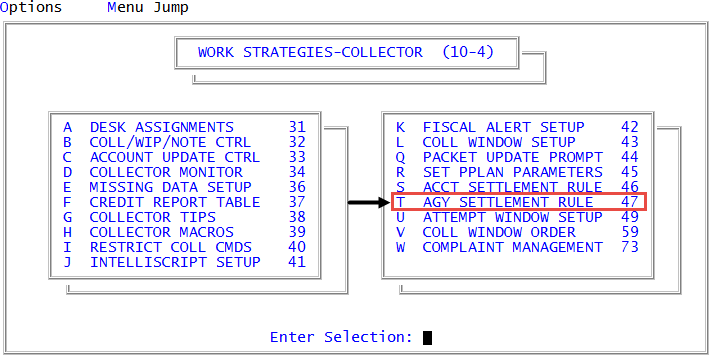 Management Strategy > Collector > Agy Settlement Rule (menu 10.4.47).