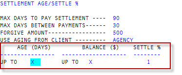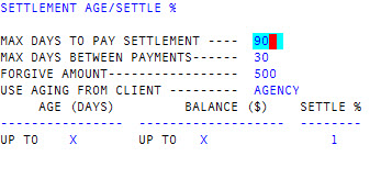 In the Settle % field, type the percentage amount the client is willing to settle based on the age and balance of the account, and press Enter.