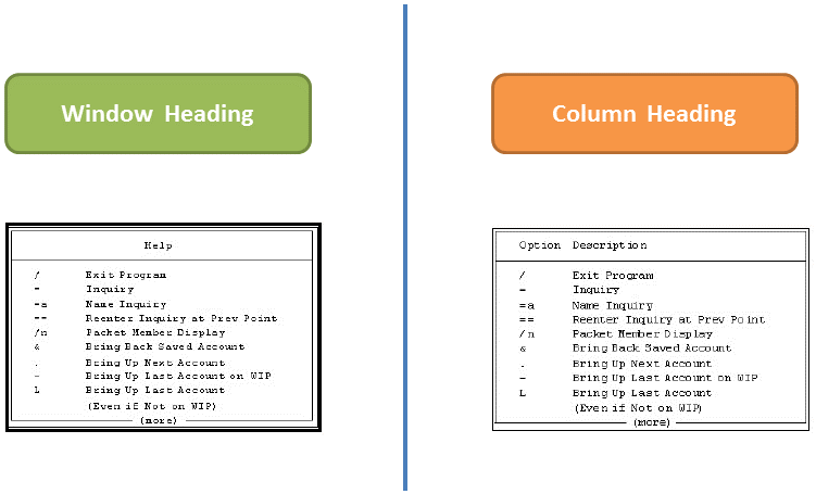 Certain displays and lists of options (such as the lists displayed when you enter a question mark in a field to find out what options are available), can be displayed with either the list name or column headings, but not both.