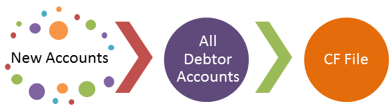 After the desk is assigned, the account information is copied from the larger database into the Collector File (also referred to as CF file) for each desk (see the following figure). The CF file contains accounts considered "active" by your agency in that they are being worked by a collector or a group of collectors.