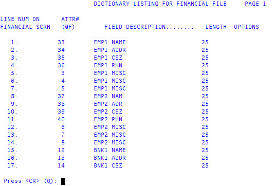 The Fiscal field dictionary is a reference list of all of the Fiscal fields. It contains the line number of the field on the Financial Profile screen, the Fiscal file attribute number, the field description, the length of the field and any additional options.
