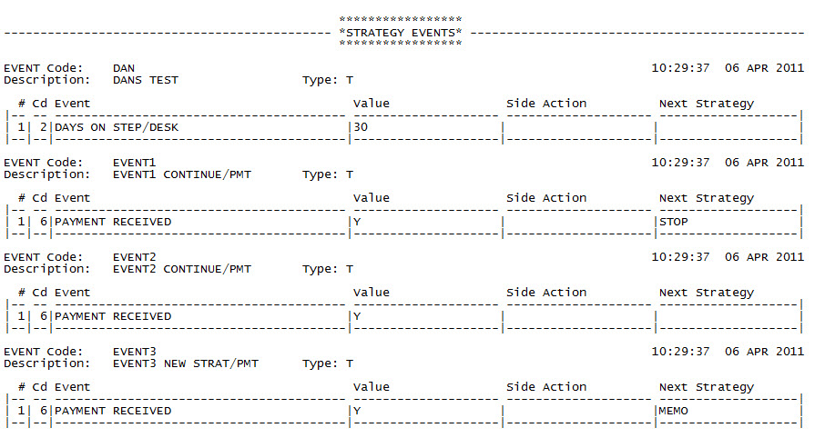 The Strategy report allows you to view a display of how all the parts of a strategy work together. It shows the relationship between the conditions, actions, and events of your strategies. You can run the report for a single strategy or for all of the strategies in your system. The report is useful for building, troubleshooting, and maintaining strategies.