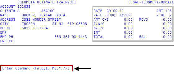 If you access the Legal Judgment screen from Legal > Update Routines > Legal Jmt Update (menu 13.4.55), the Enter Command prompt provides you with command 9, which displays the Account Update screen.