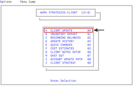 From the Master menu, navigate to Management Strategy > Client > Client Update (menu 10.6.60).