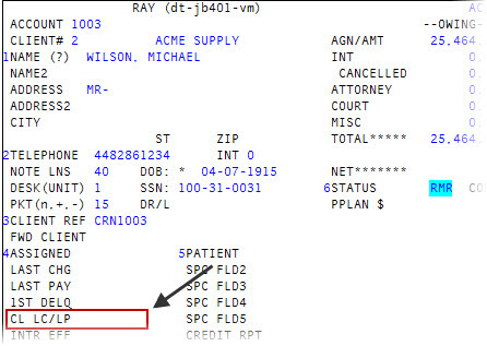 The Client Last Charge/Last Pay (CL LC/LP) field is updated by the system. It stores the date the client last charged the account or last received payment from the account before the account was assigned to your agency. The Collector System takes the information from the Last Charge or Last Pay fields when a new record is added to the system and enters it in this field.