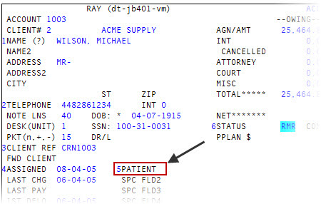 The Patient field is generally used for hospital, medical, or dental assignments. If changes are made to this field, a note is written preceded by the notation "NAMP" (Name Patient). If your agency requires that you enter information in this field, The Collector System automatically enters the account's name in this field when you press Enter. This requirement is set in the Client Control Record, field 551. Req Patient Nm. For more information, see Creating or changing the Client Control Record.