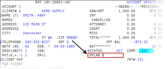 View the balance owing (Packet Display) and other important information about each account in a packet (/P) or all associated packets (/PA). This is an example of a Packet Display screen: |