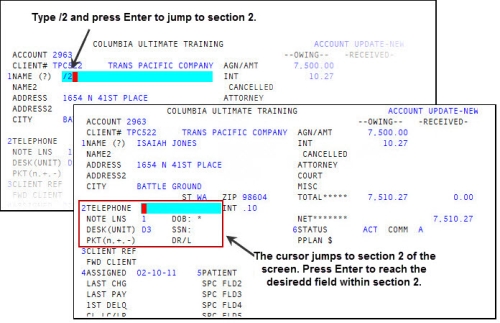 The Account Update screen has six sections for entering information. When changing account information, rather than advancing through every field on the screen, you can enter a shortcut in any field to access the section of the screen that holds the information you need to update. To do this, type a forward slash (/) and the number of the section to jump to. For example, type /2 to go to the Pkt field located in section 2 of the screen. This moves the cursor to the first field of section 2, Telephone. You then press Enter until you reach the Pkt field.