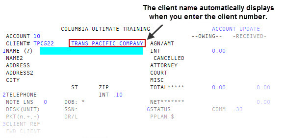 When entering two or more accounts in a row, the number of the last client entered is automatically entered in the next record and the cursor displays in the Name field. To use a different client number, type /, and press Enter to move back to the Client # field to enter the correct number. To turn the repeat feature off, contact your Finvi Support representative.