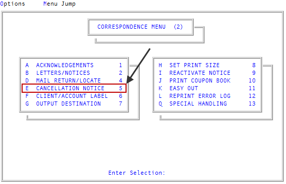 From the Master menu, navigate to Correspondence > Cancellation Notice (menu 2.5).