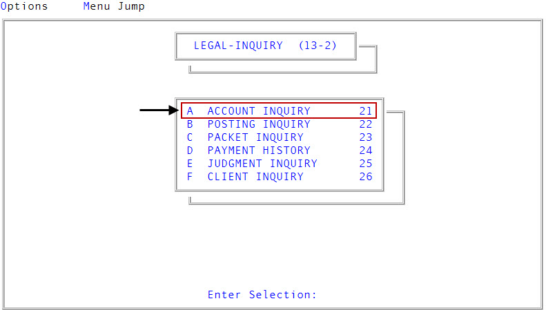 From the Master menu, navigate to Legal > Inquiry > Account Inquiry (menu 13.2.21).