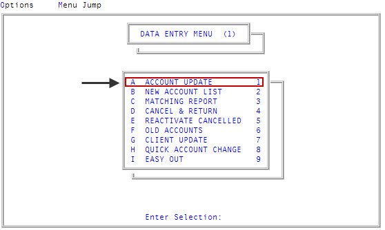 From the Master menu, navigate to Data Entry > Account Update (menu 1.1).