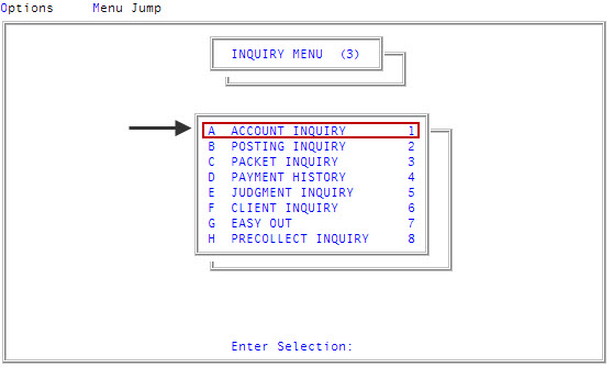 From the Master menu, navigate to Inquiry Menu > Account Inquiry (menu 3.1).