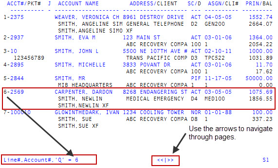 To view an account, at the Line#, Account#, 'Q' = prompt, type the line number for the account, and press Enter.