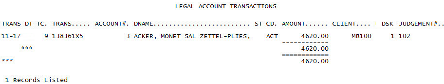 The Legal Posting report is a complete list of all transactions posted during the current month to accounts with status codes starting with L. The report can contain all transactions since the last Month-End or transactions taking place on a specified date.