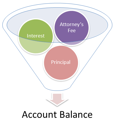 An account's balance may be made up of several different charges or charges and payments combined into one amount. The make up of the balance can include several different categories such as principal, interest, attorney fees, court fees, and so on.