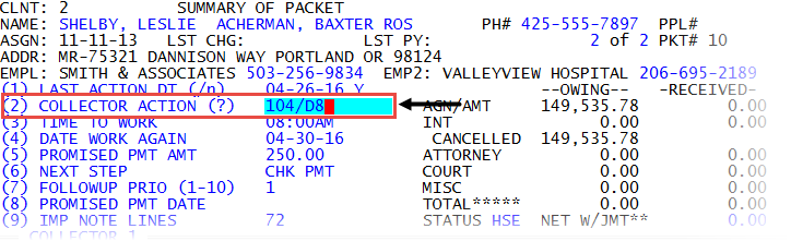 After you select the action code, The Collector System returns to the Collector screen so you can complete the specific tasks related to the action code, such as entering notes or scheduling a call back date.