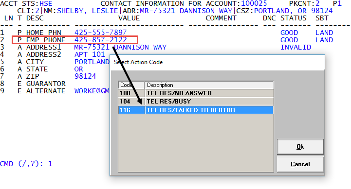 Collector screen—In the Collector Action field or account notes, enter the action code. The Collector screen then displays a list of all the phone numbers for the account, and you select the phone number you used to contact the account.