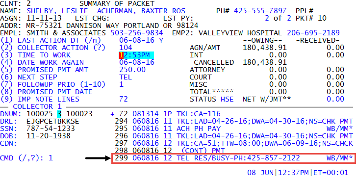 Depending on how The Collector System is set up at your agency, you may see the phone number along with the contact action code recorded in the account notes, shown as follows: