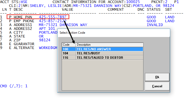 For example, a collector attempts to contact an account by calling the customer's home phone. The collector does not receive an answer, so they type /C in the Value field of the Home Phn contact type, and then select the Tel Res/No Answer action code to record the call attempt.