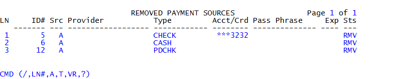 Use command VR to view a list of all the payment resources removed from the Payment Sources Configuration screen.