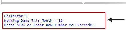 Another blank goal screen appears with the collector number and the number of days already worked this month at the bottom of the screen.