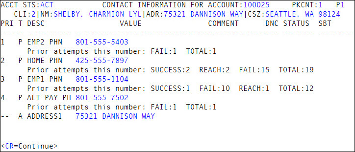 In the Personal Contacts screen, you can use command DTL to view the following information: