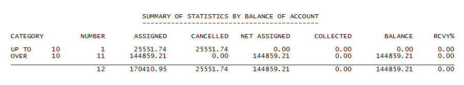 The Summary of Statistics by Balance of Account report uses the same information as the Summary of Statistics by Status report. The balance of the account is based on the balance categories set up for each client in field 153-Perf/Sts/Age/Bal of the Client Control Record. For more information, see Creating or changing the Client Control Record.
