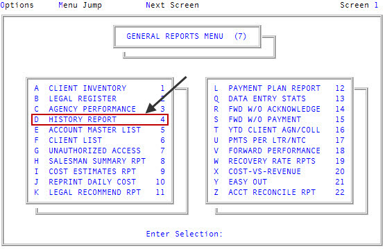 From the Master menu, navigate to General Reports > History report(menu 7.4).