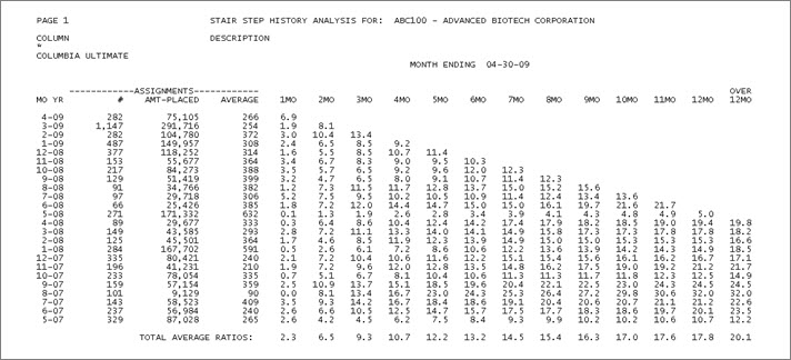 The average amount per assignment, net of adjustments. Each of the 1 Mo through 12 Mo columns shows the percentage of each period's assignments collected since they were assigned. For each column, the amount collected since assignment (the period shown in the Mo Yr column) is divided by the period's assigned amount with adjustments (the Net-Placed column) to give the percentage of the net assignments that was collected up to that time. The columns, going from left to right, are cumulative. The percentage in the 2 Mo column equals the percentage in the 1 Mo column plus the percentage collected in the following month. Generally the percentages increase; however, if there are many adjustments to the assigned amounts, the percentages can decrease yet still be correct. |