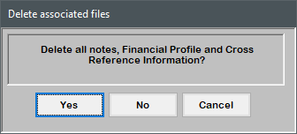 Every account file has associated notes and financial profile files. The same number is assigned to these files and the account record. For example, account 1357 is accompanied by notes file 1357 and financial file 1357. Typically, this information should also be deleted when the account record is deleted. If a new account is created using the deleted account number, any associated, undeleted files are attached to the new account.