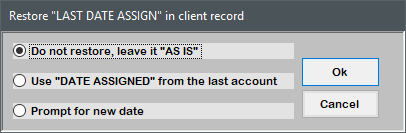 In the Restore "Last Date Assign" in client record window, do one of the following, and press Enter or click Ok: