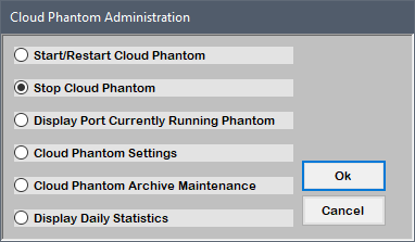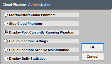 In the Cloud Phantom Administration window, select Display Port Currently Running Phantom, and press Enter or click Ok.