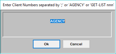 In the Enter Client Numbers... window, you can update the vendor setup for one or more clients, the agency, or clients on a list. Do one of the following, and press Enter or click Ok: