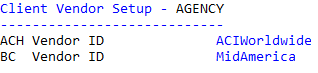 In the Client Vendor Setup screen, for each ...Vendor ID field, do one of the following, and press Enter: