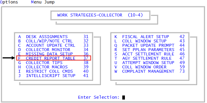 Management Strategy > Collector > Credit Report Table (menu 10.4.37). - In the Update Credit Bureau Table window, select Update Table, and press Enter or click Ok.