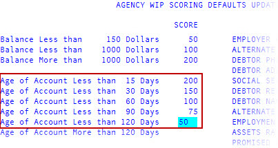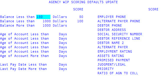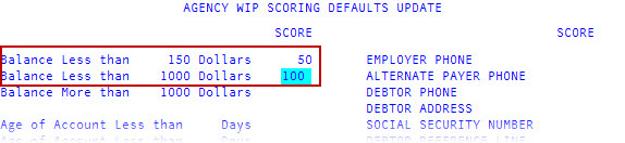 In the first Balance Less than field of the agency/desk WIP Scoring Defaults Update screen, type the first balance amount to use for assigning a score, and press Enter.