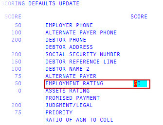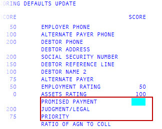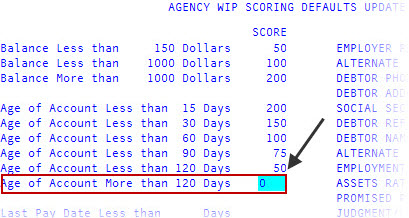 In the Last Pay Date Less than field, type the number of days after the last pay date (on the Account Update screen) to use for assigning a score to the account, and press Enter.