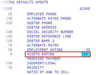 The system calculates the score by dividing the collected amount by the assigned amount, and multiplying the result by the number entered in the Ratio of Agn to Coll field. For example, if the assigned amount is $100, and the collected amount is $60, the number entered in this screen is multiplied by .60 to calculate the score.