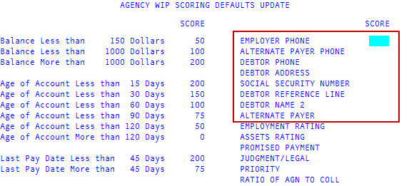 - To continue making changes to the Agency WIP Scoring Defaults Update screen, type /, and press Enter.