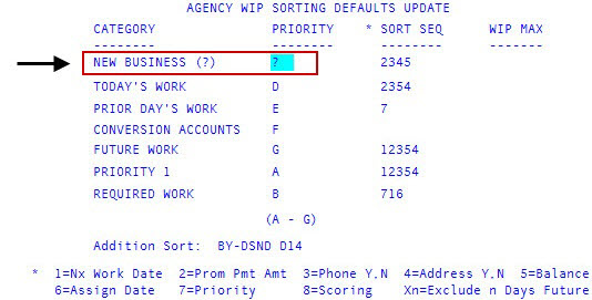 In the Priority field of the New Business category in the agency/desk WIP Sorting Defaults Update screen, type /WS, and press Enter.