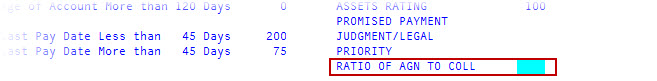 In the Ratio of Agn To Coll field, type the score to use to determine how much weight to give an account's assigned amount to the collected amount ratio, and press Enter.