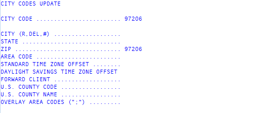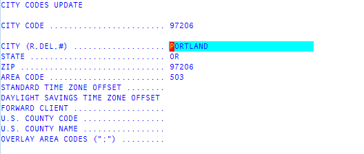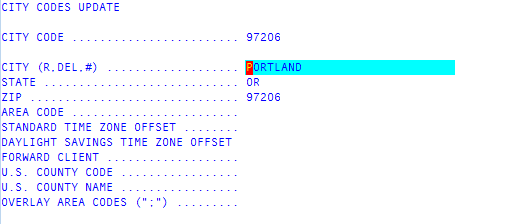 In the City Code field of the City Codes Update screen, type the city code to add or update, and press Enter or click Ok.