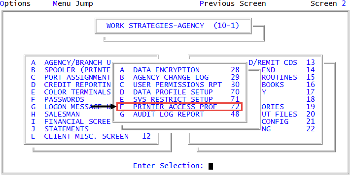 Management Strategy > Agency > Printer Access Prof (menu 10.1.72). - In the Printer Access Profile ID (?) window, do one of the following, and press Enter or click Ok: