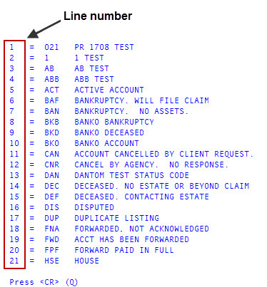 When creating a new status code, unless you specify a specific location to insert a status code in the list, the system alphabetizes the codes in the list. In order to insert a status code at a specific place in a list, you need to know the line number at which to insert it.
