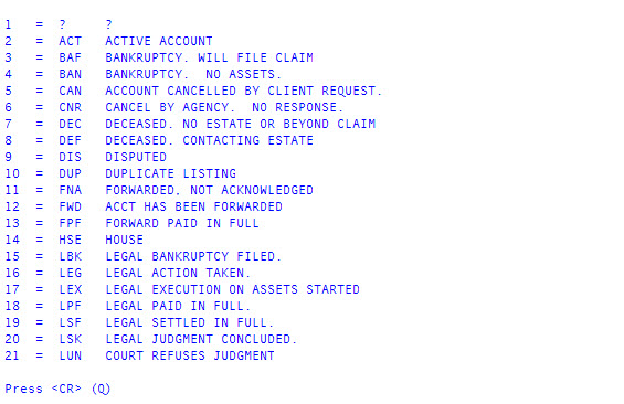 Use this option to view a list of the current status codes available in The Collector System. The screen displays the code and a description of the code.