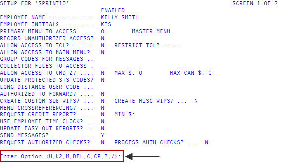 At the Enter Option prompt in the User Login screen, type U2 to access the second screen, and press Enter.