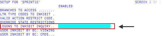 - To prevent the user from running inquiries across specific logons, type each logon, separating each with a semicolon.