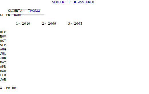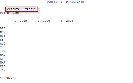 In the Client# field of the screen 1- # Assigned, type the code your agency uses to identify this client, and press Enter.